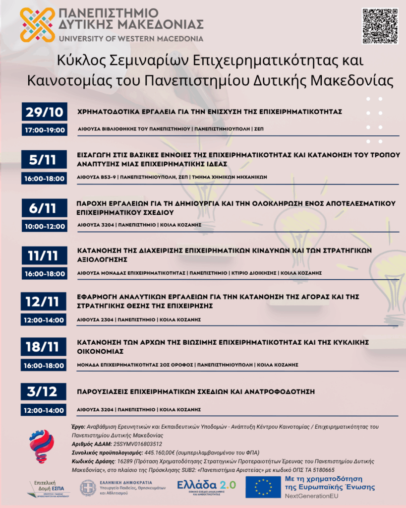 Κύκλος Σεμιναρίων Επιχειρηματικότητας και Καινοτομίας του ΠΔΜ Categories Ανακοινώσεις Date 30 Οκτωβρίου 2025 Προηγούμενο Παράταση προθεσμίας υποβολής ηλεκτρονικών αιτήσεων για τη χορήγηση δωρεάν σίτισης 30 Οκτωβρίου 2025 Επόμενο Αιτήσεις για τις Κατατακτήριες Εξετάσεις ακαδημαϊκού έτους 2025-2026 3 Νοεμβρίου 2025